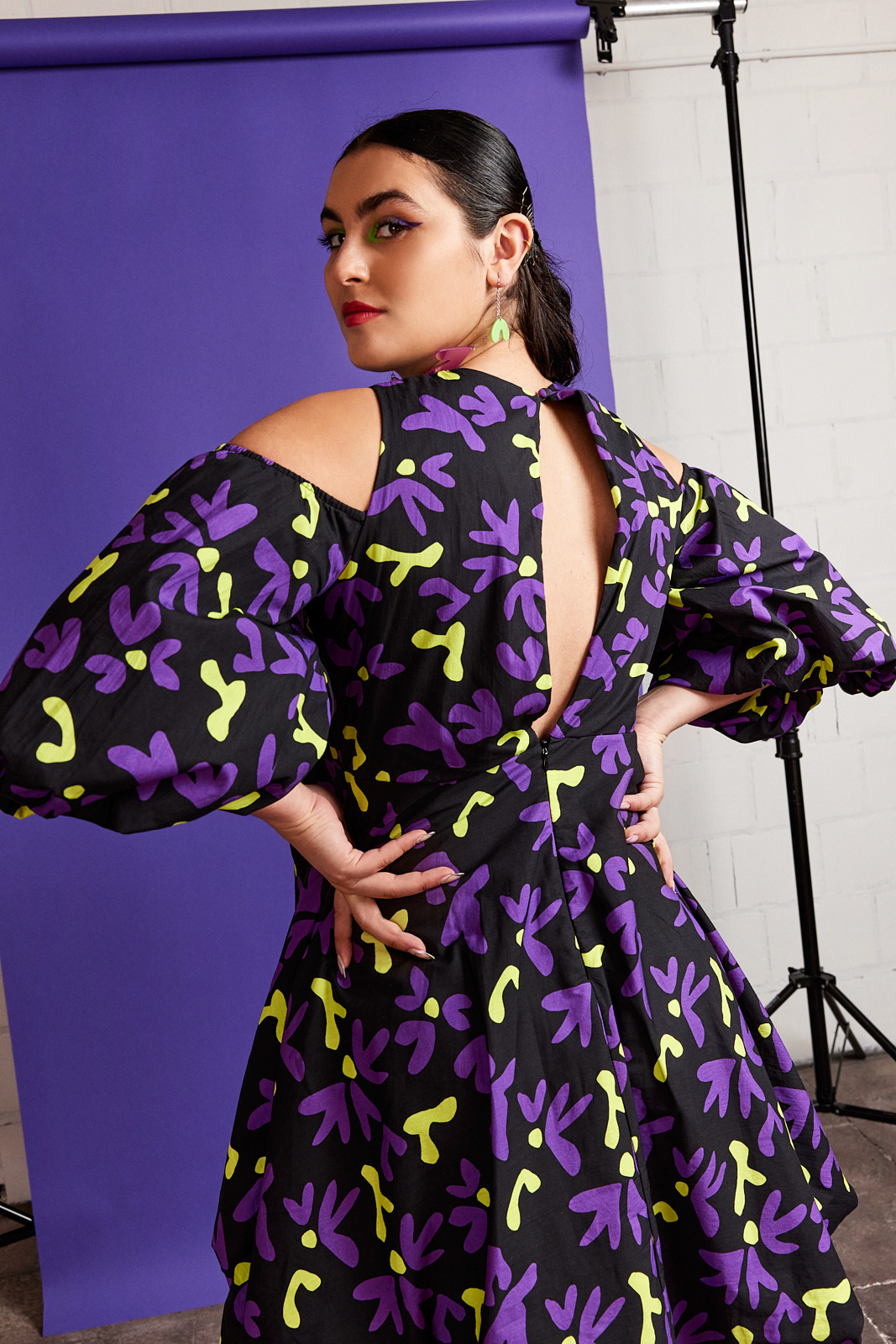 A summer dress designed as an ode to my grandmother. LolaLiza stands for the empowerment of women, and my grandmother is the strongest woman I know. Since I study in Sweden I miss her a lot. Therefore I created this poofy summer dress in cotton, with a flower print inspired by her garden and veranda flowers. I created matching earrings as well, both will come in the shops at the end of May!
